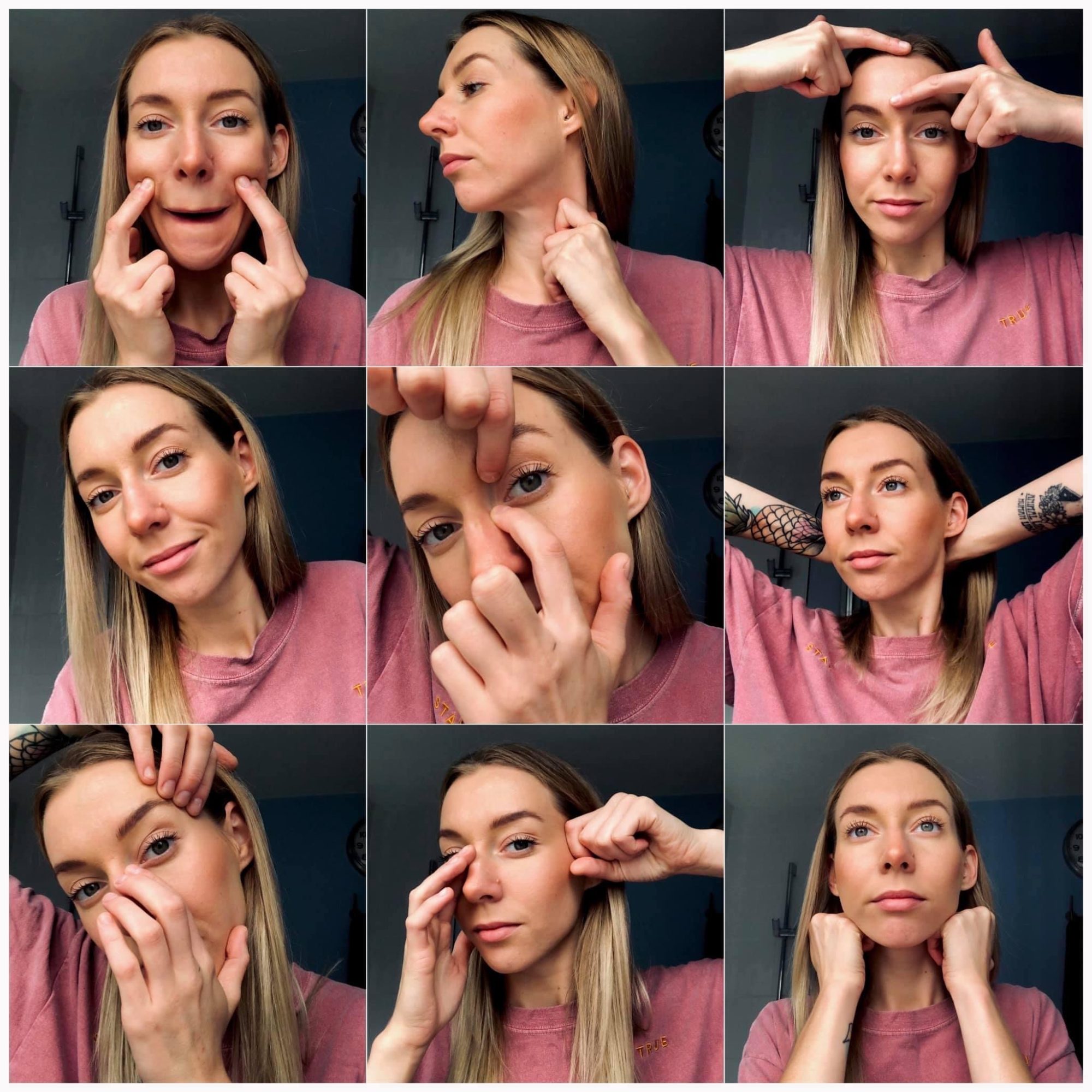 Podnoszenie policzków. Aby wykonać to ćwiczenie, umieść palce wskazujące i środkowe każdej ręki po bokach twarzy. Następnie powoli przesuwaj palce w górę w kształcie litery V, podnosząc skórę policzków. Powtarzaj ruch przez jedną minutę.