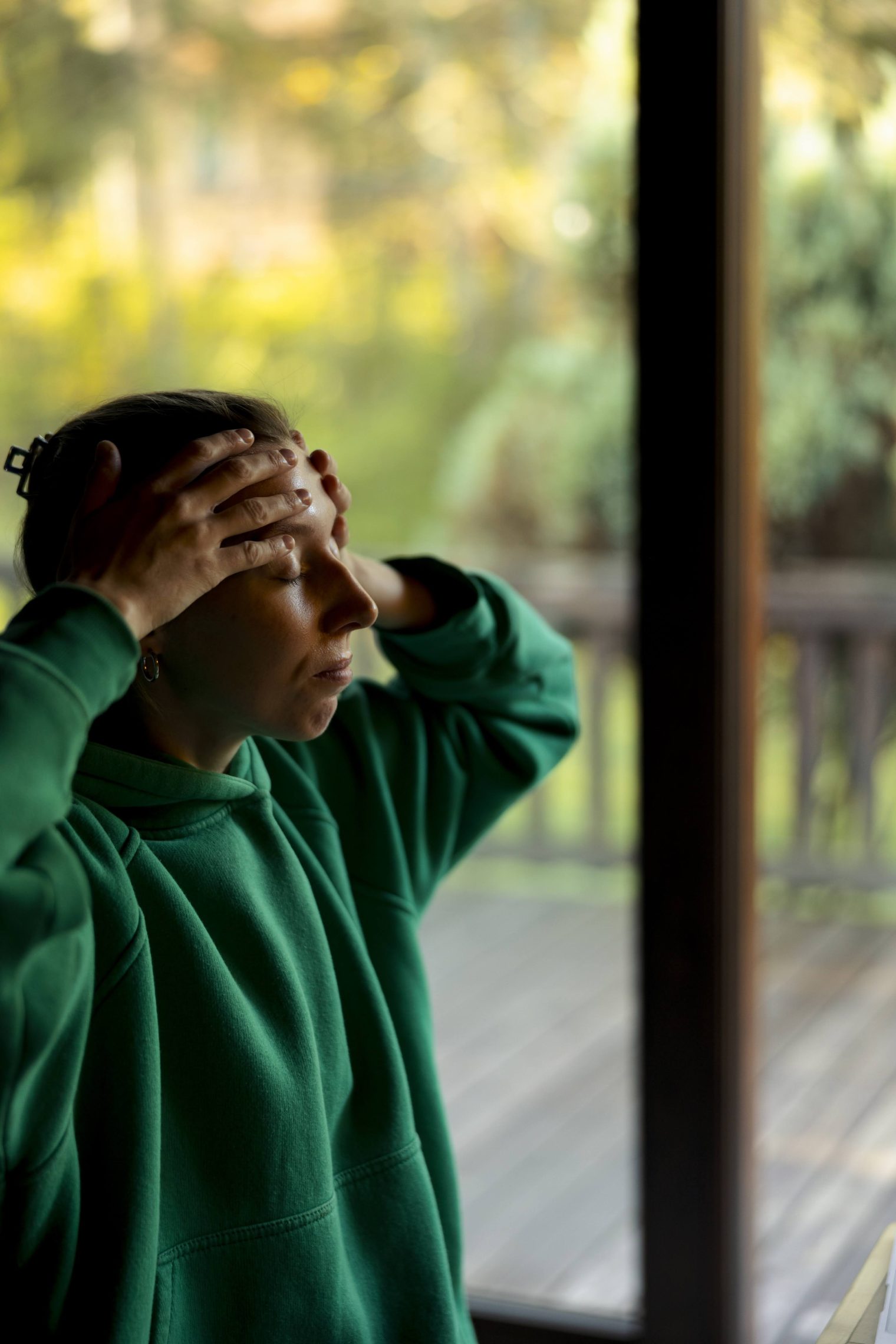Umieść palce na środku czoła i wygładzaj na zewnątrz poziomymi liniami. Siła nacisku jest średnia. Powtarzaj 60 sekund.