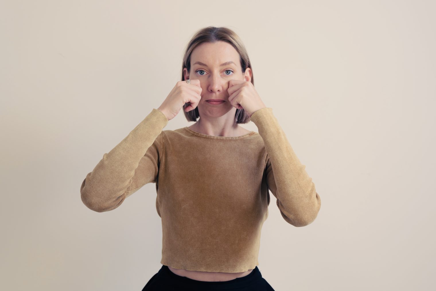Delikatnie zaciskaj palce na całej powierzchni policzka kciukiem i dwoma pierwszymi palcami przez trzydzieści sekund. Kieruj się od środka twarzy na zewnątrz.